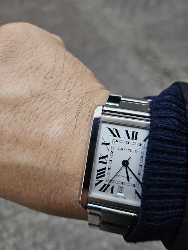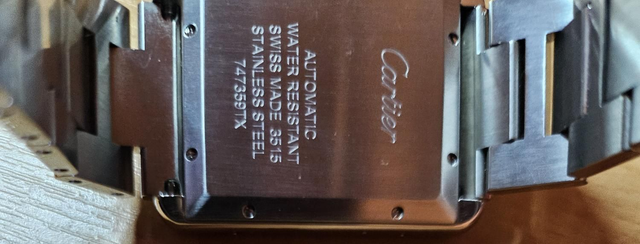 Montre Cartier Tank XL d'occasion (2022). Boîtier et bracelet en acier inoxydable (31,0 x 40,85 mm), cadran argenté avec aiguilles bleuies en forme d'épée, date et grande trotteuse. Mouvement automatique. Numéro de série : 3515. Carte de garantie incluse.